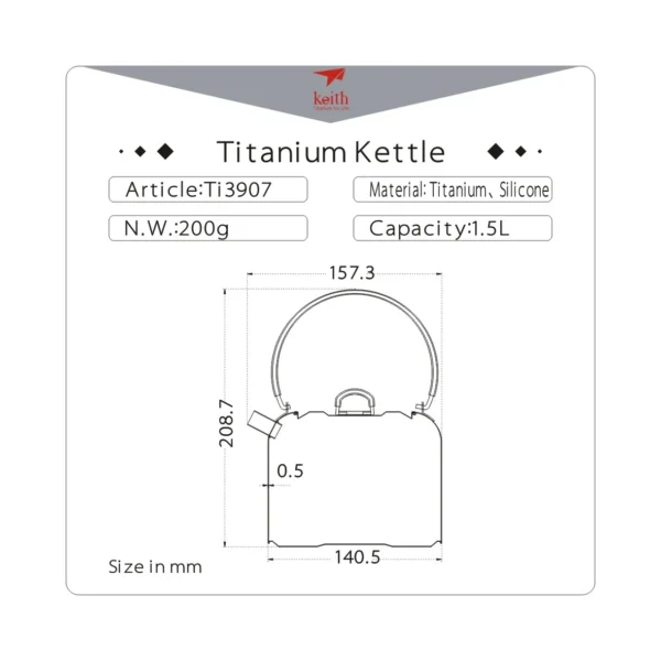 Keith Titanium Ti3907 1.5 L Kettle is made of premium pure titanium grade 1 without lining and coating. It is tasteless, odorless, non-toxic and dishwasher safe. Originally designed for backpacking, camping and traveling, it is also great for picnicking, emergency prepping and around the home, school and office. The handle insulating tubes are made of silicone. It comes with a custom made mesh storage sack.